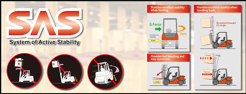 System of Active Stability (SAS) là hệ thống cân bằng chủ động được Toyota phát triển và giữ độc quyền trên các dòng xe nâng của mình. Đây là công nghệ được cấp bằng sáng chế và chỉ có mặt trên xe nâng Toyota – một điểm khác biệt quan trọng so với các thương hiệu khác.