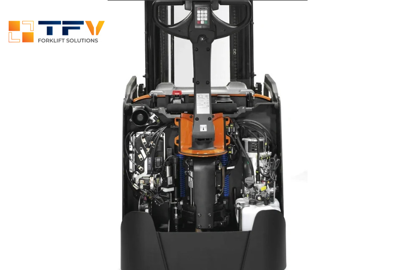 Thiết kế mở (Easy access for maintenance) giúp kỹ thuật viên dễ dàng tiếp cận các bộ phận chính như bộ điều khiển AC, mô-tơ nâng và cụm thủy lực.