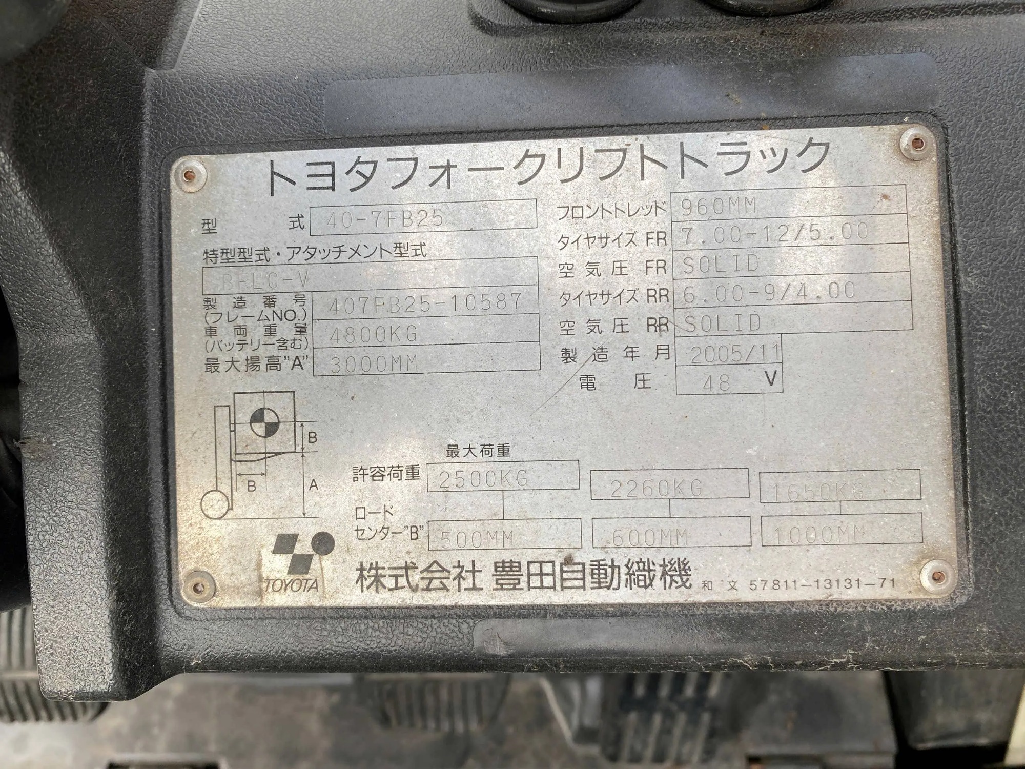 Bảng thông số xe Xe nâng điện cũ ngồi lái 2.5 tấn Toyota 7FB25