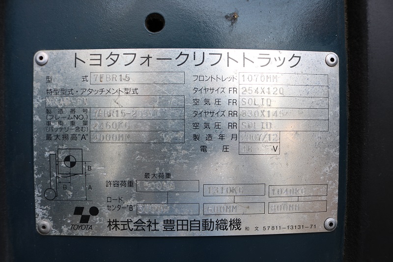 Tải trọng 1500kg Số khung 7FBR15-26567 Tải trọng xe 2460kg Bình ắc quy 48V 332AH Năm sản xuất 12/2007 |