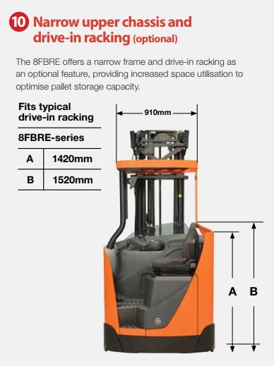 Dòng Toyota 8FBRE Series là thế hệ reach truck cao cấp nhất của Toyota ở phân khúc xe nâng đứng lái – lối đi hẹp. Đây là dòng xe được thiết kế để vận hành trong không gian giới hạn nhưng yêu cầu chiều cao nâng rất lớn, tốc độ nâng nhanh và khả năng xoay trở linh hoạt.